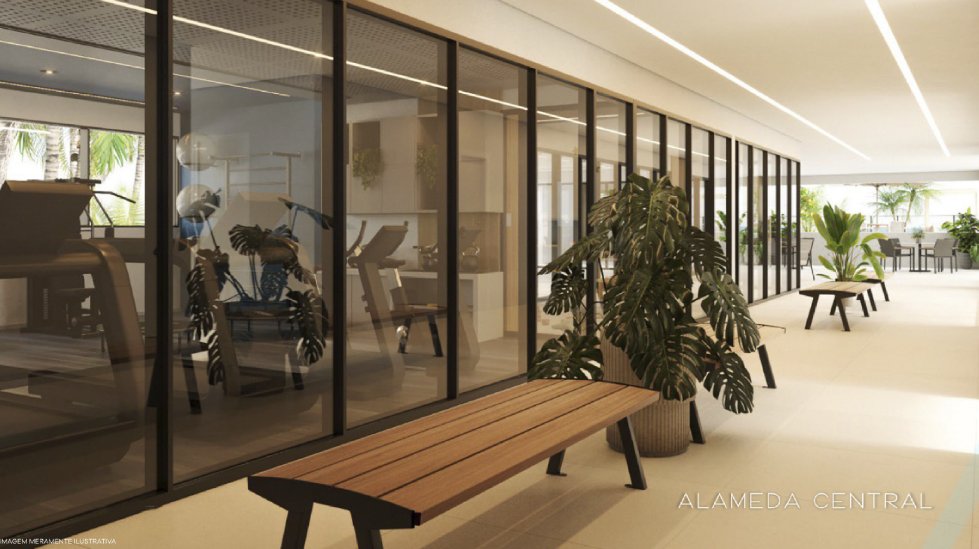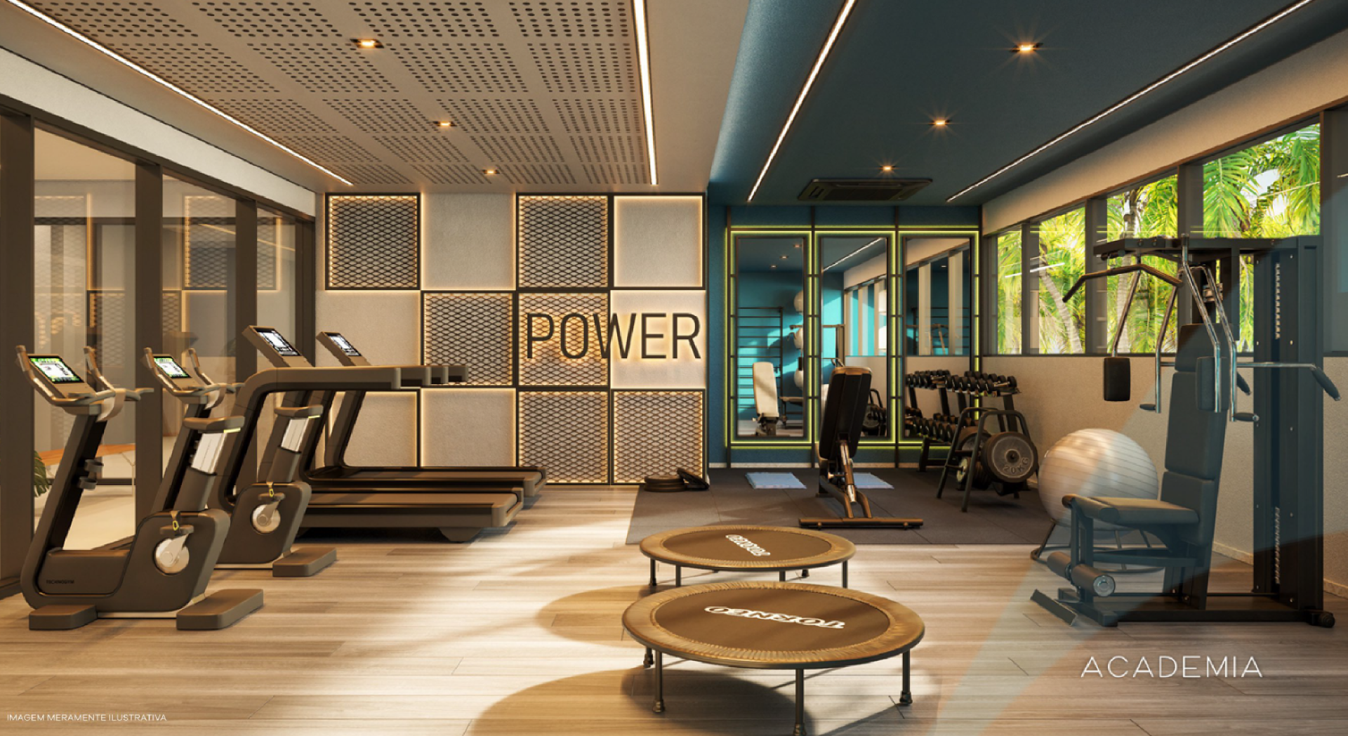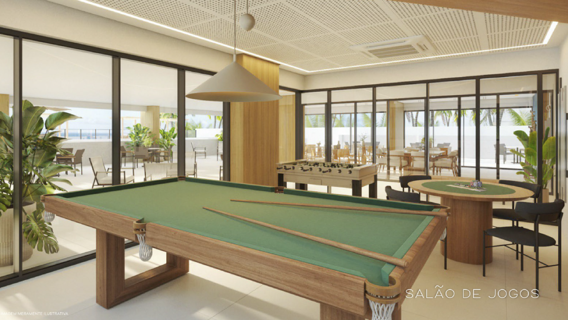 Área de lazer com piscina com vista panorâmica, academia, salão de jogos e salão de festas.